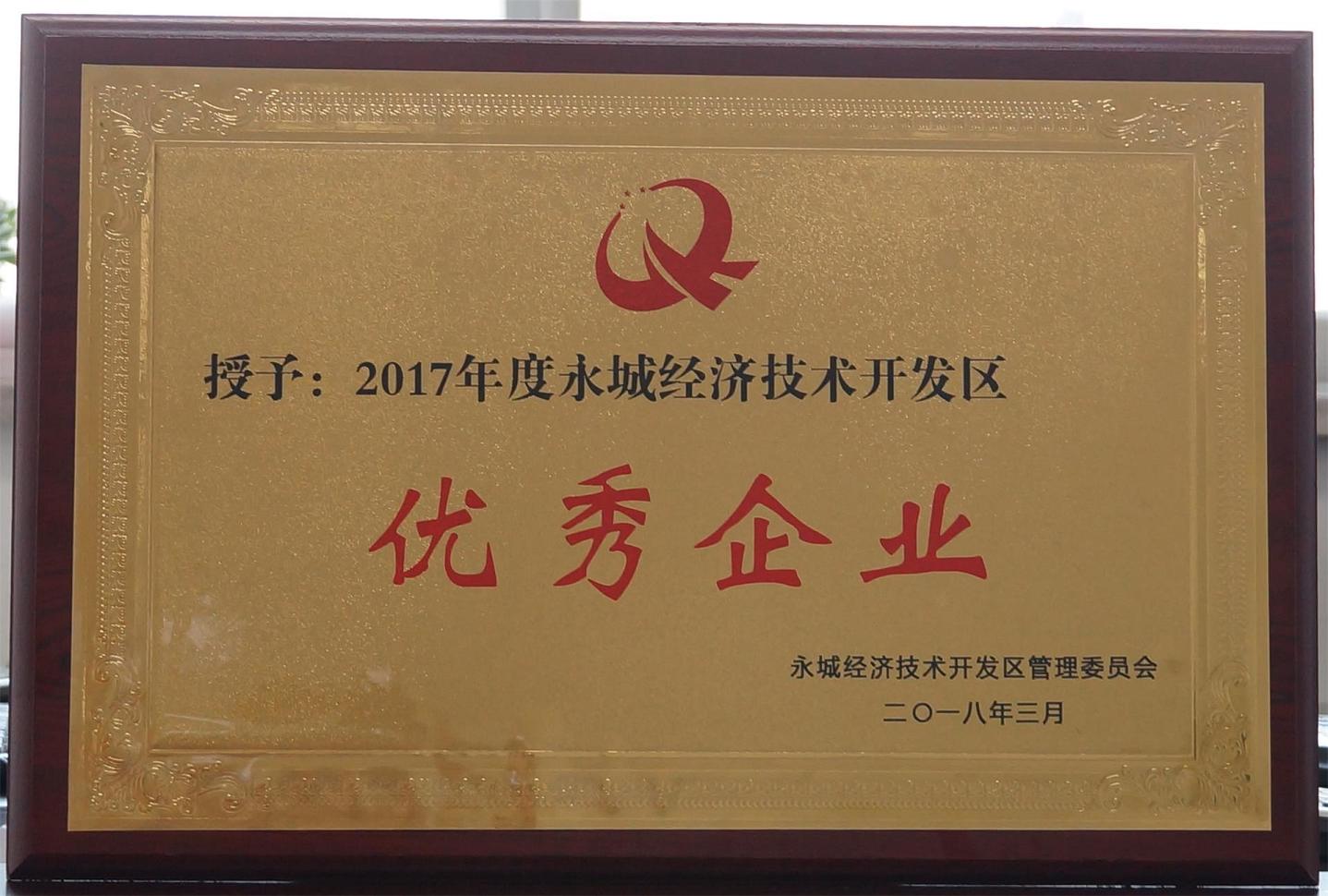 2018年3月10日公司喜獲“永城市經(jīng)濟技術(shù)開發(fā)區(qū)2017年度優(yōu)秀企業(yè)”榮譽稱號